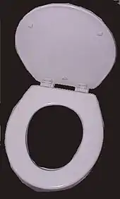 A toilet seat is a hinged unit consisting of a round or oval open seat, and usually a lid, which is bolted onto the bowl of a toilet used in a sitting position (as opposed to a squat toilet). The seat can be either for a flush toilet or a dry toilet. A toilet seat consists of the seat itself, which may be contoured for the user to sit on, and the lid, which covers the toilet when it is not in use – the lid may be absent in some cases, particularly in public restrooms.
