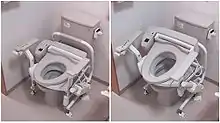 A combination squat/sitting toilet also exists, where a seat can be flipped down over a squat toilet, and the toilet can be used essentially the same way as the Western style.[8] This hybrid seems to be common only in rural areas for the benefit of resident foreigners. Adapters that sit on top of the Japanese toilet to convert it to a functional sit-down toilet are much more common. There are also permanently installed extensions available to convert a squat toilet into a sitting-style washlet.