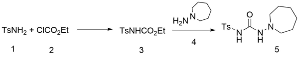 para-Toluenesulfonamide is converted to its carbamate with ethyl chloroformate in the presence of a base. Heating that intermediate with 1-amino-azepane leads to the displacement of the ethoxy group and the formation of tolazemide:[1]
