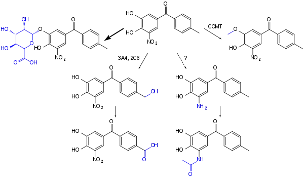 - Jorga K, Fotteler B, Heizmann P, Gasser R (October 1999). "Metabolism and excretion of tolcapone, a novel inhibitor of catechol-O-methyltransferase". British Journal of Clinical Pharmacology. 48 (4): 513–20. doi:10.1046/j.1365-2125.1999.00036.x. PMC 2014389. PMID 10583021.