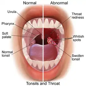 Tonsillitis is inflammation of the tonsils in the upper part of the throat. It can be acute or chronic.[8][9][2] Acute tonsillitis typically has a rapid onset.[10] Symptoms may include sore throat, fever, enlargement of the tonsils, trouble swallowing, and enlarged lymph nodes around the neck.[1][2] Complications include peritonsillar abscess (Quinsy).[1][3]