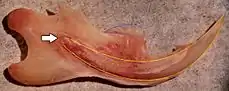 Teeth are not always attached to the jaw, as they are in mammals. In many reptiles and fish, teeth are attached to the palate or to the floor of the mouth, forming additional rows inside those on the jaws proper. Some teleosts even have teeth in the pharynx. While not true teeth in the usual sense, the dermal denticles of sharks are almost identical in structure and are likely to have the same evolutionary origin. Indeed, teeth appear to have first evolved in sharks, and are not found in the more primitive jawless fish – while lampreys do have tooth-like structures on the tongue, these are in fact, composed of keratin, not of dentine or enamel, and bear no relationship to true teeth.[1] Though "modern" teeth-like structures with dentine and enamel have been found in late conodonts, they are now supposed to have evolved independently of later vertebrates' teeth.[5][6]