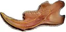 Rodents have upper and lower hypselodont incisors that can continuously grow enamel throughout its life without having properly formed roots.[24] These teeth are also known as aradicular teeth, and unlike humans whose ameloblasts die after tooth development, rodents continually produce enamel, they must wear down their teeth by gnawing on various materials.[25] Enamel and dentin are produced by the enamel organ, and growth is dependent on the presence of stem cells, cellular amplification, and cellular maturation structures in the odontogenic region.[26] Rodent incisors are used for cutting wood, biting through the skin of fruit, or for defense. This allows for the rate of wear and tooth growth to be at equilibrium.[24] The microstructure of rodent incisor enamel has shown to be useful in studying the phylogeny and systematics of rodents because of its independent evolution from the other dental traits. The enamel on rodent incisors are composed of two layers: the inner portio interna (PI) with Hunter-Schreger bands (HSB) and an outer portio externa (PE) with radial enamel (RE).[27] It usually involves the differential regulation of the epithelial stem cell niche in the tooth of two rodent species, such as guinea pigs.[28][29]