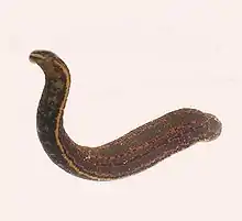 Historically the European medicinal leech, another invertebrate parasite, has been used in medicine to remove blood from patients.[47] They have three jaws (tripartite) that resemble saws in both appearance and function, and on them are about 100 sharp teeth used to incise the host. The incision leaves a mark that is an inverted Y inside of a circle. After piercing the skin and injecting anticoagulants (hirudin) and anaesthetics, they suck out blood, consuming up to ten times their body weight in a single meal.[48]