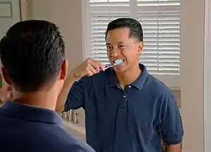 A toothbrush is an instrument used to clean teeth, consisting of a small brush on a handle. Toothpaste, often containing fluoride, is commonly added to a toothbrush to aid in cleaning. Toothbrushes come in manual and electric varieties. Although there is conflicting evidence as to which is more effective, most evidence points to electric toothbrushes with an oscillatory motion being more effective than manual toothbrushes, with toothbrushes lacking an oscillatory motion being equivalent.[41] A 2014 Cochrane review found moderate evidence that electric toothbrushes reduce plaque and gingivitis more than manual ones.[41] Overall, both manual and electric toothbrushes are effective, however, and it is often recommended that people use whichever they feel comfortable with, determine is affordable for them, and will be more likely to regularly brush with.[42]