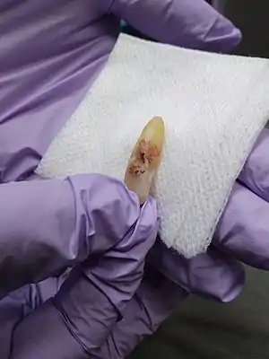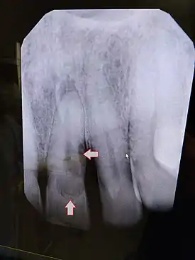 Root resorption most commonly occurs due to inflammation caused by pulp necrosis, trauma, periodontal treatment, orthodontic tooth movement and tooth whitening.[3] Less common causes include pressure from malpositioned ectopic teeth, cysts, and tumors.[4][5][6]