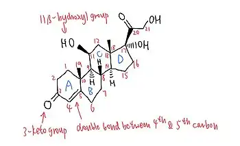 Hydrocortisone, or 17-hydroxycorticosterone, is under the class of glucocorticoids, which are steroids synthesized in the adrenal cortex of the kidneys.[29][30] In order to illustrate its glucocorticoid activity, the A ring of hydrocortisone has a keto group in the 3rd carbon and a double bond between the 4th and 5th carbon.[31] For the C ring of the compound, the 11th carbon has a beta hydroxyl substitution, which is also necessary for the drug to demonstrate glucocorticoid effects.[31]
