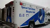 - Bicycle Unit - Paramedics equipped with mountain bikes, capable of providing either BLS or ALS services in off-road areas, or at special events. Team also works in concert with the Toronto Police bike team to provide first response capabilities in the Entertainment District on weekend nights.
