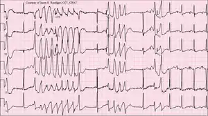 Torsades de pointes, torsade de pointes or torsades des pointes (TdP) (/tɔːˌsɑːd də ˈpwæ̃t/,[2] French: [tɔʁsad də pwɛ̃t̪], translated as "twisting of peaks") is a specific type of abnormal heart rhythm that can lead to sudden cardiac death. It is a polymorphic ventricular tachycardia that exhibits distinct characteristics on the electrocardiogram (ECG). It was described by French physician François Dessertenne in 1966.[3] Prolongation of the QT interval can increase a person's risk of developing this abnormal heart rhythm, occurring in between 1% and 10% of patients who receive QT-prolonging antiarrhythmic drugs.[4]