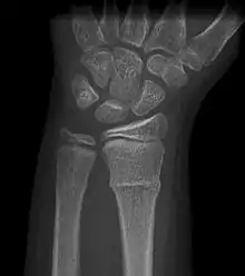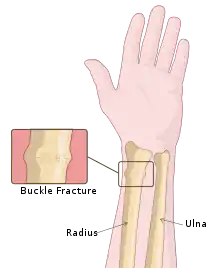 A Torus fracture, also known as a buckle fracture is the most common fracture in children.[1] It is a common occurrence following a fall, as the wrist absorbs most of the impact and compresses the bony cortex on one side and remains intact on the other, creating a bulging effect.[2] As the bulge is only on one side of the bone, this injury is can be classified as an incomplete fracture. The compressive force is provided by the trabeculae and is longitudinal to the axis of the long bone, meaning that the fracture itself is orthogonal to that axis.[3] The word "torus" originates from the Latin word "protuberance."[4]