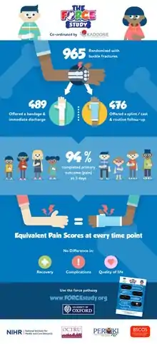 There is no established 'standard' treatment for buckle fractures. However, in 2022 the largest and highest quality treatment study was published about this injury in the Lancet medical journal - called the FORCE Study[9] (see infographic in images). The study was conducted throughout the UK in 21 emergency departments. This study fairly allocated children (through randomisation) to either splint and routine follow-up, or a bandage and no follow-up. 965 children were in this study, which showed equivalent results for pain scores, function and complications between the treatments. This offered clinicians, parents and young people reassurance that this fracture will heal well, without complications and immobilisation and follow-up is almost always not needed.