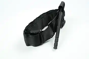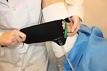 In the 2000s, the silicon ring tourniquet, or elastic ring tourniquet, was developed by Noam Gavriely, a professor of medicine and former emergency physician.[19][20] The tourniquet consists of an elastic ring made of silicone, stockinet, and pull straps made from ribbon that are used to roll the device onto the limb. The silicone ring tourniquet exsanguinates the blood from the limb while the device is being rolled on, and then occludes the limb once the desired occlusion location is reached.[1] Unlike the historical mechanical tourniquets, the device reduces the risk of nerve paralysis.[21][22] The surgical tourniquet version of the device is completely sterile, and provides improved surgical accessibility due to its narrow profile that results in a larger surgical field. It has been found to be a safe alternative method for most orthopedic limb procedures, but it does not completely replace the use of contemporary tourniquet devices.[23][24] More recently the silicone ring tourniquet has been used in the fields of emergency medicine and vascular procedures.[20][25]