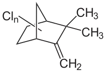 Toxaphene is a synthetic organic mixture composed of over 670 chemicals, formed by the chlorination of camphene (C10H16) to an overall chlorine content of 67–69% by weight.[3][5][9] The bulk of the compounds (mostly chlorobornanes, chlorocamphenes, and other bicyclic chloroorganic compounds) found in toxaphene have chemical formulas ranging from C10H11Cl5 to C10H6Cl12, with a mean formula of C10H10Cl8.[10] The formula weights of these compounds range from 308 to 551 grams/mole; the theoretical mean formula has a value of 414 grams/mole. Toxaphene is usually seen as a yellow to amber waxy solid with a piney odor. It is highly insoluble in water but freely soluble in aromatic hydrocarbons and readily soluble in aliphatic organic solvents. It is stable at room temperature and pressure.[3] It is volatile enough to be transported for long distances through the atmosphere.[11][12]