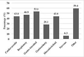 The classic in-utero symptoms of tracheal agenesis are an absence of the trachea leading to congenital high airway obstruction syndrome,[12][13] lung distention, polyhydramnios, heart malformations, heart displacement and hydrops fetalis.[1][12][14][15] Other congenital malformations such as genitourinary, gastrointestinal and musculoskeletal anomalies are common and occur in 80% of the reported cases.[16][11]