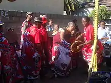 During the training period the ithwasa will share their ailments in the form of song and dance, a process that is nurtured by the analysis of dreams, anxieties, and with prayer. The story develops into a song which becomes a large part of the graduation-type ceremony that marks the end of the ukuthwasa training.[44] At times in the training, and for the graduation, a ritual sacrifice of an animal is performed (usually chickens and a goat or a cow).[45]