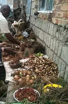 A sangoma is a practitioner of ngoma, a philosophy based on a belief in ancestral spirits (siSwati: amadloti; Zulu: amadlozi; Sesotho: badimo; Xhosa: izinyanya) and the practice of traditional African medicine, which is often a mix of medicinal plants and various animal body fats or skin.[12][13] Sangomas perform a holistic and symbolic form of healing by drawing on the embedded beliefs of the Bantu peoples in South Africa, who believe that ancestors in the afterlife guide and protect the living.[14] Sangomas are called to heal, and through them it is believed that ancestors from the spirit world can give instruction and advice to heal illness, social disharmony and spiritual difficulties.[15] Traditional healers work in a sacred healing hut or indumba, where they believe their ancestors reside.[16] Where no physical 'indumba' is available, a makeshift miniature sacred place called imsamo can be used.