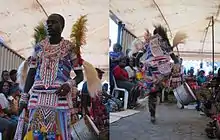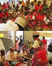 Sangoma can also literally mean 'person of the drum' or 'the drumming one'[47] and drumming is an important part of summoning the ancestors. During times of celebration (e.g. at an Initiation) the possessed sangoma is called to dance and celebrate their ancestors. The sangoma will fall into trance (when in trance the Sangoma is not conscious of what is happening, so after that he/she will be told of the things he/she had said) where the ancestors will be channeled (which is signified in Zulu traditions by episodes of convulsive fits) followed by the singing of ancestral songs. These songs are echoed back to the ancestor via the audience in a process of call and response. The possessed sangoma will then change into their traditional ancestral clothing and dance vigorously while others drum and sing in celebration.[18]