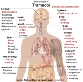 Main side effects of tramadol: Red color denotes more serious effects, requiring immediate contact with health provider.[4]