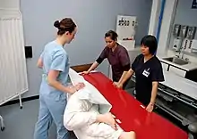 Placing a transfer board (red) under a patient