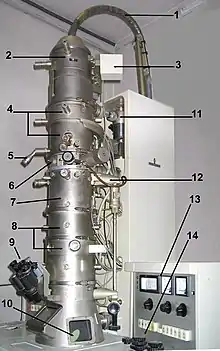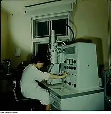 Research continued on the electron microscope at Siemens in 1936, where the aim of the research was the development and improvement of TEM imaging properties, particularly with regard to biological specimens. At this time electron microscopes were being fabricated for specific groups, such as the "EM1" device used at the UK National Physical Laboratory.[11] In 1939, the first commercial electron microscope, pictured, was installed in the Physics department of IG Farben-Werke. Further work on the electron microscope was hampered by the destruction of a new laboratory constructed at Siemens by an air raid, as well as the death of two of the researchers, Heinz Müller and Friedrick Krause during World War II.[12]