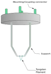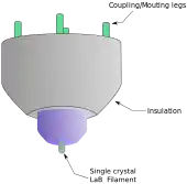 This equation shows that in order to achieve sufficient current density it is necessary to heat the emitter, taking care not to cause damage by application of excessive heat. For this reason materials with either a high melting point, such as tungsten, or those with a low work function (LaB6) are required for the gun filament.[37] Furthermore, both lanthanum hexaboride and tungsten thermionic sources must be heated in order to achieve thermionic emission, this can be achieved by the use of a small resistive strip. To prevent thermal shock, there is often a delay enforced in the application of current to the tip, to prevent thermal gradients from damaging the filament, the delay is usually a few seconds for LaB6, and significantly lower for tungsten.
