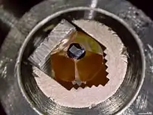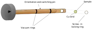 The second design is the top-entry holder consists of a cartridge that is several cm long with a bore drilled down the cartridge axis. The specimen is loaded into the bore, possibly using a small screw ring to hold the sample in place. This cartridge is inserted into an airlock with the bore perpendicular to the TEM optic axis. When sealed, the airlock is manipulated to push the cartridge such that the cartridge falls into place, where the bore hole becomes aligned with the beam axis, such that the beam travels down the cartridge bore and into the specimen. Such designs are typically unable to be tilted without blocking the beam path or interfering with the objective lens.[25]