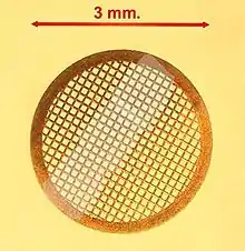 TEM specimen stage designs include airlocks to allow for insertion of the specimen holder into the vacuum with minimal loss of vacuum in other areas of the microscope. The specimen holders hold a standard size of sample grid or self-supporting specimen. Standard TEM grid sizes are 3.05 mm diameter, with a thickness and mesh size ranging from a few to 100 μm. The sample is placed onto the meshed area having a diameter of approximately 2.5 mm. Usual grid materials are copper, molybdenum, gold or platinum. This grid is placed into the sample holder, which is paired with the specimen stage. A wide variety of designs of stages and holders exist, depending upon the type of experiment being performed. In addition to 3.05 mm grids, 2.3 mm grids are sometimes, if rarely, used. These grids were particularly used in the mineral sciences where a large degree of tilt can be required and where specimen material may be extremely rare. Electron transparent specimens have a thickness usually less than 100 nm, but this value depends on the accelerating voltage.