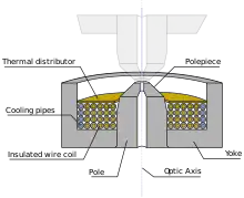 The coils which produce the magnetic field are located within the lens yoke. The coils can contain a variable current, but typically use high voltages, and therefore require significant insulation in order to prevent short-circuiting the lens components. Thermal distributors are placed to ensure the extraction of the heat generated by the energy lost to resistance of the coil windings. The windings may be water-cooled, using a chilled water supply in order to facilitate the removal of the high thermal duty.