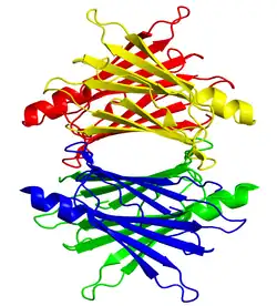 TTR is a 55kDa homotetramer with a dimer of dimers quaternary structure that is synthesized in the liver, choroid plexus and retinal pigment epithelium for secretion into the bloodstream, cerebrospinal fluid and the eye, respectively. Each monomer is a 127-residue polypeptide rich in beta sheet structure. Association of two monomers via their edge beta-strands forms an extended beta sandwich. Further association of two of these dimers in a face-to-face fashion produces the homotetrameric structure and creates the two thyroxine binding sites per tetramer. This dimer-dimer interface, comprising the two T4 binding sites, is the weaker dimer-dimer interface and is the one that comes apart first in the process of tetramer dissociation.[12]