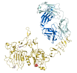 ![]() Trastuzumab Fab region (cyan) binding HER2/neu (gold) | |