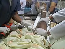 Infixing a distal femoral traction pin, preopt for a fractured femur.