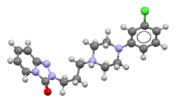 Trazodone is metabolized by several liver enzymes, including CYP3A4, CYP2D6, and CYP1A2.[7][73] Its active metabolite meta-chlorophenylpiperazine (mCPP) is known to be formed by CYP3A4 and metabolized by CYP2D6.[7] Inhibition or induction of the aforementioned enzymes by various other substances may alter the metabolism of trazodone and/or mCPP, leading to increased and/or decreased blood concentrations.[8][14] The enzymes in question are known to be inhibited and induced by many medications, herbs, and foods, and as such, trazodone may interact with these substances. Potent CYP3A4 inhibitors such as clarithromycin, erythromycin, fluvoxamine, grapefruit juice, ketoconazole, and ritonavir may lead to increased concentrations of trazodone and decreased concentrations of mCPP, while CYP3A4 inducers like carbamazepine, enzalutamide, phenytoin, phenobarbital, and St. John's wort may result in decreased trazodone concentrations and increased mCPP concentrations.[8][14][9] CYP2D6 inhibitors may result in increased concentrations of both trazodone and mCPP while CYP2D6 inducers may decrease their concentrations.[7][8][10] Examples of potent CYP2D6 inhibitors include bupropion, cannabidiol, duloxetine, fluoxetine, paroxetine, quinidine, and ritonavir, while CYP2D6 inducers include dexamethasone, glutethimide, and haloperidol. CYP1A2 inhibitors may increase trazodone concentrations while CYP1A2 inducers may decrease trazodone concentrations. Examples of potent CYP1A2 inhibitors include ethinylestradiol (found in hormonal birth control), fluoroquinolones (e.g., ciprofloxacin), fluvoxamine, and St. John's wort, while potent CYP1A2 inducers include phenytoin, rifampin, ritonavir, and tobacco.