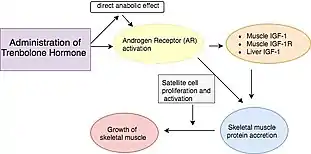 Similar to many other AAS, trenbolone acetate has the capability to produce insulin-like growth factor-1 (IGF-1).[28][29] This naturally produced protein-based hormone affects every cell in the body of an organism and plays a large role in muscle recovery and rejuvenation. Extreme muscle growth and cell splitting compared is facilitated through trenbolone acetate administration when compared to other AAS.[28] The facilitation of IGF-1 plays a significant role in the functions and properties of the central nervous system, pulmonary system, muscle tissue, ligaments, cartilage, and tendons.[29]