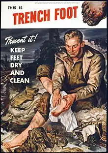 Trench foot was an informal name applied to the condition from its prevalence during the trench warfare of World War I.[1] Health officials at the time used a variety of other terms as they studied the condition but trench foot was eventually formally sanctioned and used.[2] Informally, it was also known as jungle rot during the Vietnam War.[5]