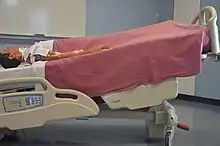 In the Trendelenburg position, the body is lain supine, or flat on the back on a 15–30 degree incline with the feet elevated above the head.[1] The reverse Trendelenburg position, similarly, places the body supine on an incline but with the head now being elevated.