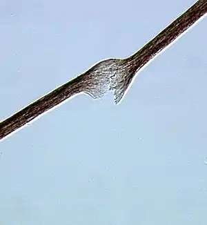 Microscopic analysis of the hair shows twisted hairs of unequal size and different shapes (pili torti, aniso- and poikilotrichosis), longitudinal breaks and breaks located at nodes (trichorrhexis nodosa). Scanning electron microscopy might reveal hair budding (trichorrhexis blastysis). Biochemical analysis may reveal sulfur-deficient brittle hair (trichothiodystrophy; note that disulfide bonds determine hair waviness).