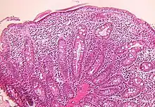 Microscopic examination of a biopsy of the small bowel in these patients shows villous atrophy with low or no mononuclear cell infiltration of the lamina propria nor specific abnormalities involving the epithelium. The amount of villous atrophy does not explain the severity of the diarrhea.