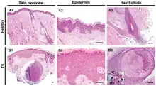 TS was first described in a 1995 case report as "ciclosporin-induced folliculodystrophy", thought at the time to be an adverse effect of ciclosporin treatment.[3][13] A subsequent report in 1999, which introduced the term "trichodysplasia spinulosa", used electron microscopy to identify the presence of virus particles in affected cells consistent with what were at the time known as papovaviruses.[14] (The group has since been divided into the papillomavirus and polyomavirus families.) In 2010, researchers used rolling circle amplification to recover viral DNA from TS lesions and thus discovered a novel polyomavirus, trichodysplasia spinulosa polyomavirus (TSPyV). There is compelling evidence that TSPyV is the direct causative agent of TS.[2][3]