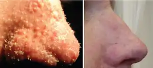 | The nose of a patient diagnosed with trichodysplasia spinulosa. Left panel shows characteristic findings of facial papules, protrusive keratotic spicules, and thickened skin; right panel shows appearance following treatment with topical cidofovir.[1] | |