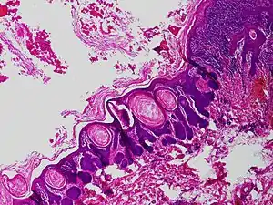 Trichofolliculoma is a cutaneous condition characterized by a benign, highly structured tumor of the pilosebaceous unit.[1][2] Trichofolliculoma is a rare tumor of the eyelid. It can be suspected by the “cotton bag sign”[3]