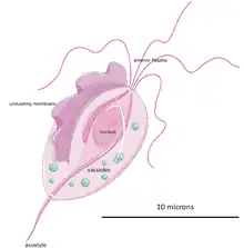 Trichomonas vaginalis observed by scanning electron microscopy showing the axostyle (ax), the anterior flagella (af) and the undulating membrane (rf).[1]