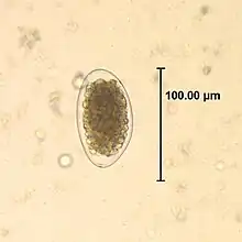 The adult worms live in the small intestine. The diagnosis is based on the observation of eggs in the stool. The eggs are 85–115 um, oval, elongated, and pointed at one or both ends.[3] Trichostrongylus eggs must be differentiated from hookworm eggs, which are smaller and do not have pointed ends.[1][3]