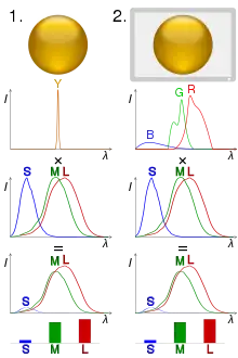 In column 1, a ball is illuminated by monochromatic light. Multiplying the spectrum by the cones' spectral sensitivity curves gives the response for each cone type.