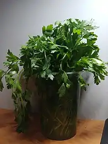 In 1932, 60 European women experienced TOCP poisoning by means of the abortion-inducing (abortifacient) drug Apiol.[5] This drug, formed by the phenylpropanoid compound extracted from parsley leaves, was exploited throughout history—and even known to Hippocrates himself—as an agent to terminate pregnancies.[12] The contamination of the modern drug in 1932 was not accidental, but rather included as an "additional stimulus."[5] Those who took the pill experienced comas, convulsions, paralysis of the lower body (paraplegia) and often death [13] Apiol was subsequently criticized by doctors, journalists, and activists alike until its discontinuation, citing that the dangers were too great and the number of poisonings were likely higher than accounted for.[14]