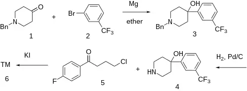 The Grignard reaction between 1-benzyl-4-piperidone [3612-20-2] (1) and 3-bromobenzotrifluoride [401-78-5] (2) gives 1-benzyl-4-(3-(trifluoromethyl)phenyl)piperidin-4-ol, CID:12718203 (3). Catalytic hydrogenation removes the benzyl protecting group to give 4-[3-(trifluoromethyl)phenyl]-4-piperidinol [2249-28-7] (4). Alkylation with 4-Chloro-4'-fluorobutyrophenone [3874-54-2] (5) introduces the sidechain and hence completed the synthesis of Trifluperidol (6).