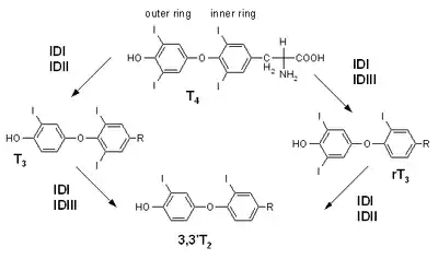 - Dietrich JW, Brisseau K, Boehm BO (August 2008). "[Absorption, transport and bio-availability of iodothyronines]" [Absorption, transport and bio-availability of iodothyronines]. Deutsche Medizinische Wochenschrift (in German). 133 (31–32): 1644–1648. doi:10.1055/s-0028-1082780. PMID 18651367.