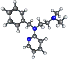 Tripelennamine, sold under the brand name Pyribenzamine by Novartis, is a drug that is used as an antipruritic and first-generation antihistamine. It can be used in the treatment of asthma, hay fever, rhinitis, and urticaria, but is now less common as it has been replaced by newer antihistamines. The drug was patented at CIBA, which merged with Geigy into Ciba-Geigy, and eventually becoming Novartis.