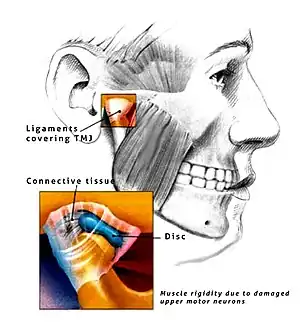 Trismus, commonly called lockjaw as associated with tetanus, is a condition of limited jaw mobility.[1] It may be caused by spasm of the muscles of mastication or a variety of other causes.[2] Temporary trismus occurs much more frequently than permanent trismus.[3] It is known to interfere with eating, speaking, and maintaining proper oral hygiene. This interference, specifically with an inability to swallow properly, results in an increased risk of aspiration. In some instances, trismus presents with altered facial appearance. The condition may be distressing and painful. Examination and treatments requiring access to the oral cavity can be limited, or in some cases impossible, due to the nature of the condition itself.