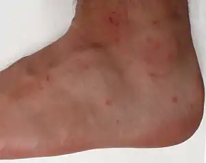 Chiggers seem to affect warm covered areas of the body more than drier areas.[1][2] Thus, the bites are often clustered behind the knees, or beneath tight undergarments such as socks, underwear, or brassieres. Areas higher in the body (chest, back, waist-band, and under-arms) are affected more easily in small children than in adults, since children are shorter and are more likely than adults to come in contact with low-lying vegetation and dry grass where chiggers thrive. An exceptional case has been described in the eye,[3] producing conjunctivitis.