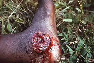 | The left foot of a person with acute tropical ulcer upon his admission to Toborra Goroka Hospital, in Goroka, Papua New Guinea. | |